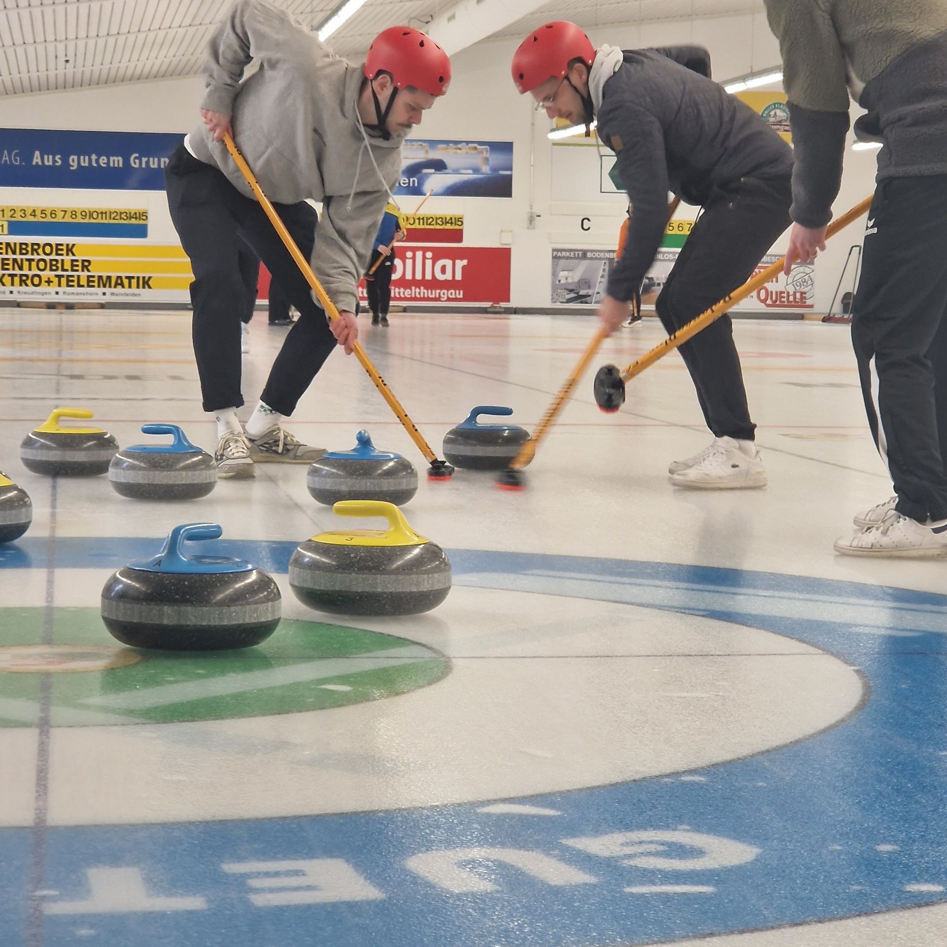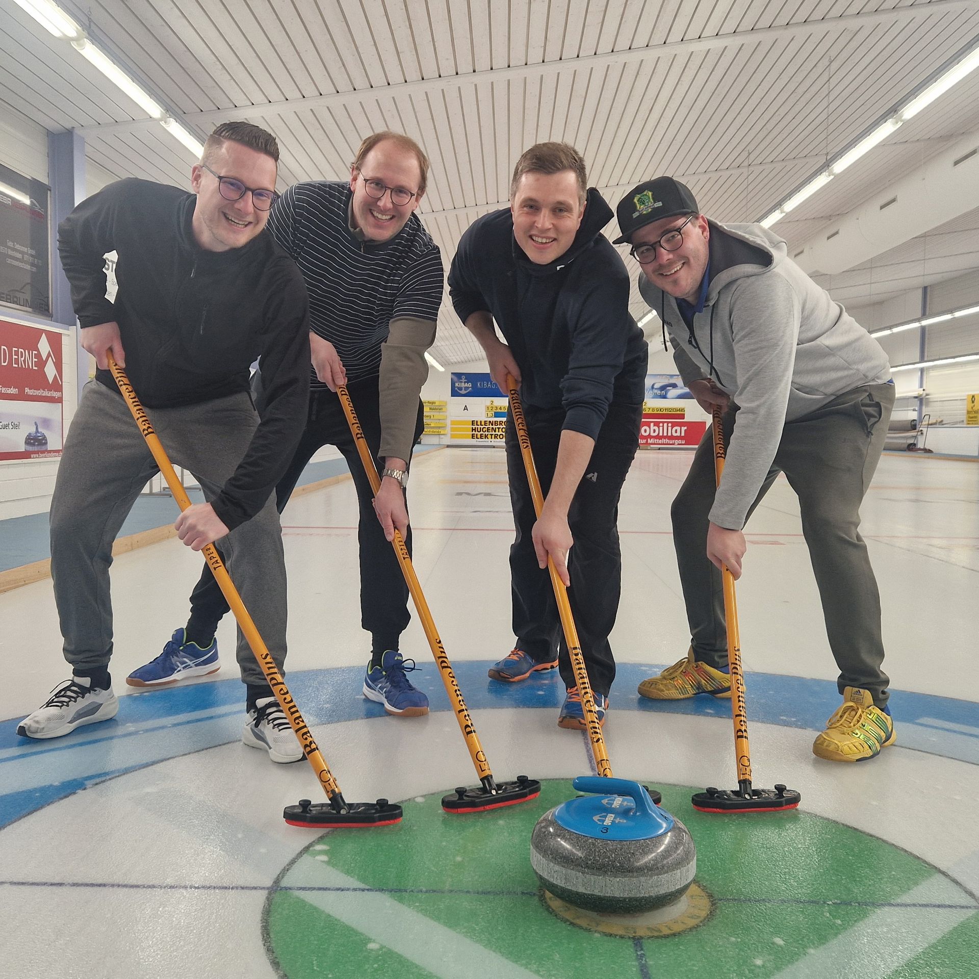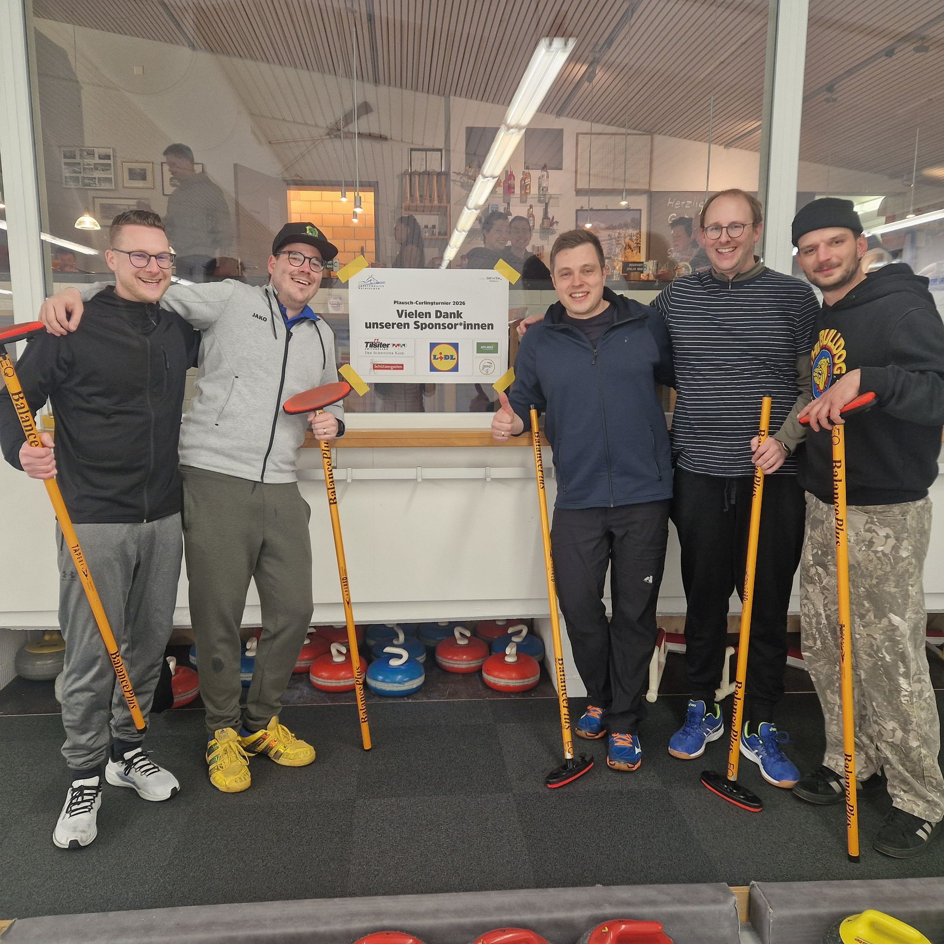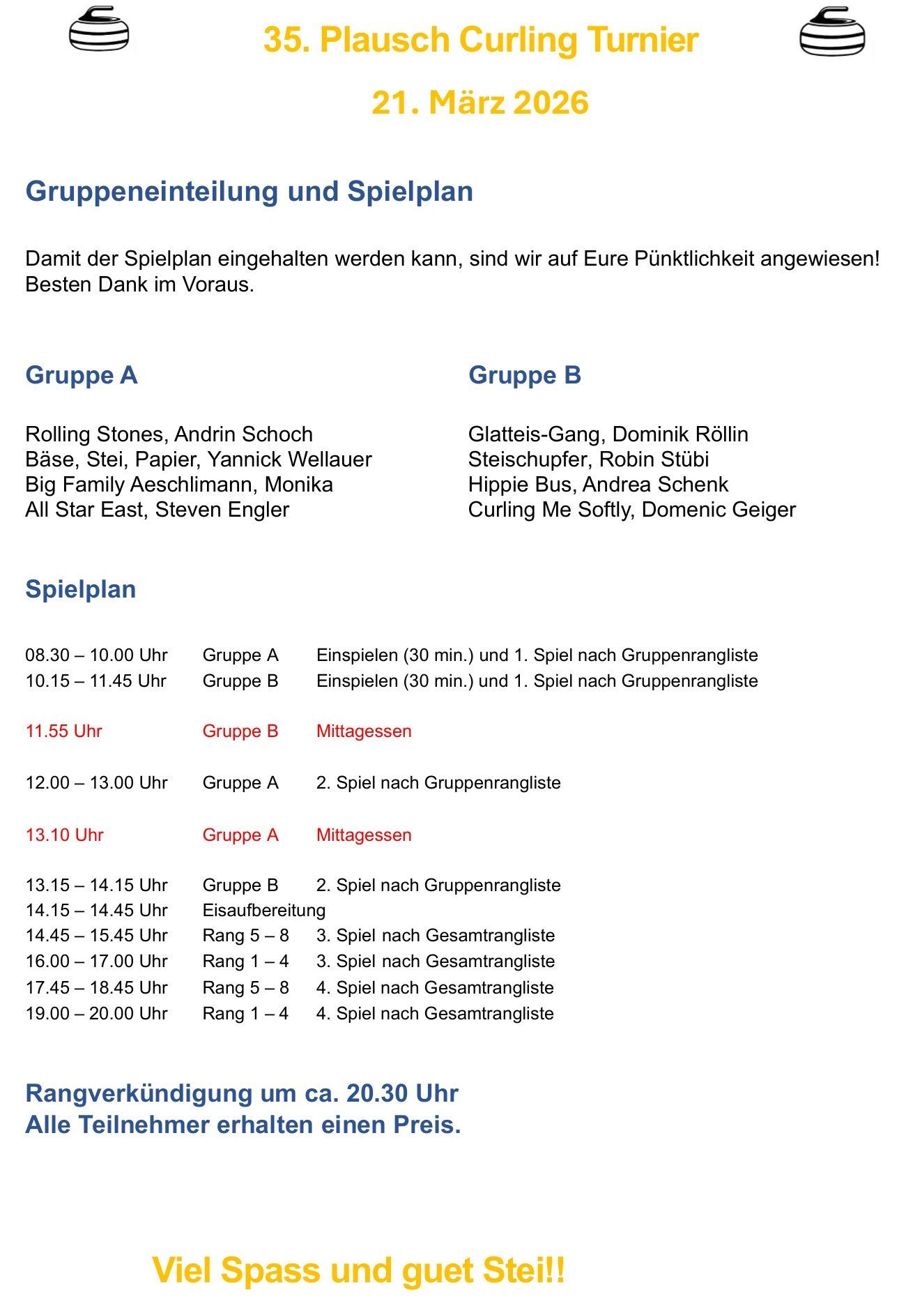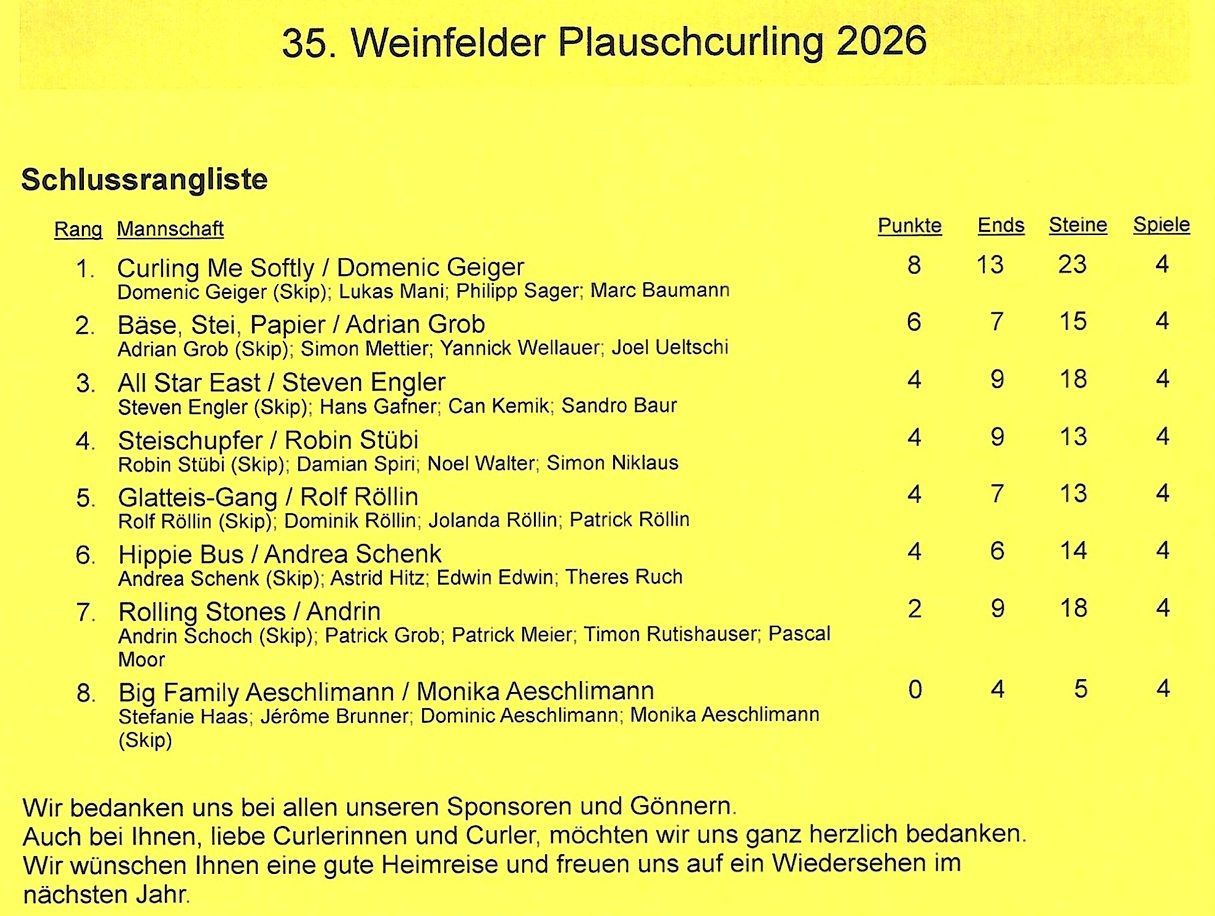 Für den Samstag 21. März 2026 haben sich 8 Teams zum 35. Weinfelder Plauschcurling-Turnier angemeldet. Pünktlich um 8:30 konnte das Turnier gemäss Spielplan gestartet werden. Wieder einmal ist es gelungen, 32 Teilnehmer vom Curling spielen zu begeistern. Mit viel Elan, Freude, Ehrgeiz und vor allem unfallfrei bis zum letzten spannenden Spiel. Wie die Schlussrangliste zeigt, mussten Zuschauer wie Spieler bis zum letzten gespielten Stein ausharren, bis das Siegerteam feststand.